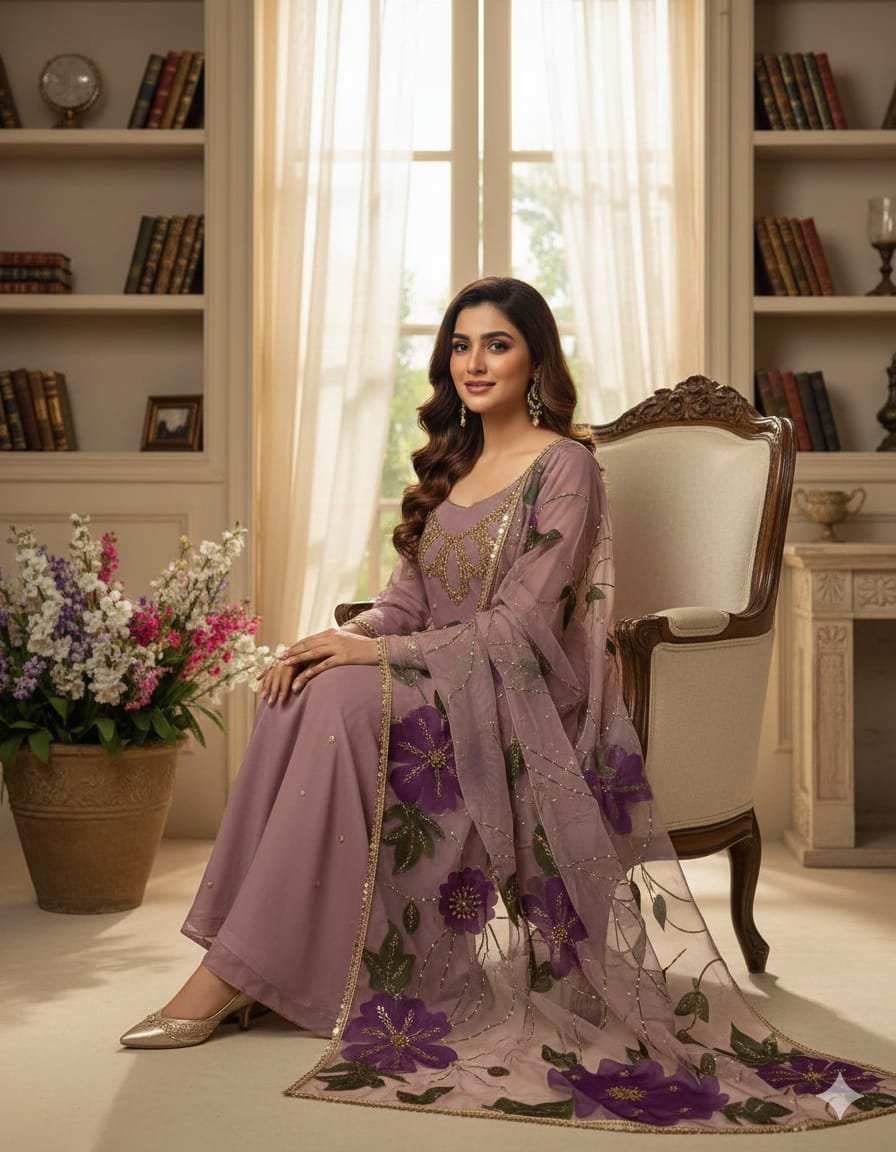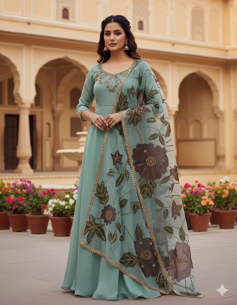 - Stunning organza shirt adorned with intricate handwork, stones, and beads