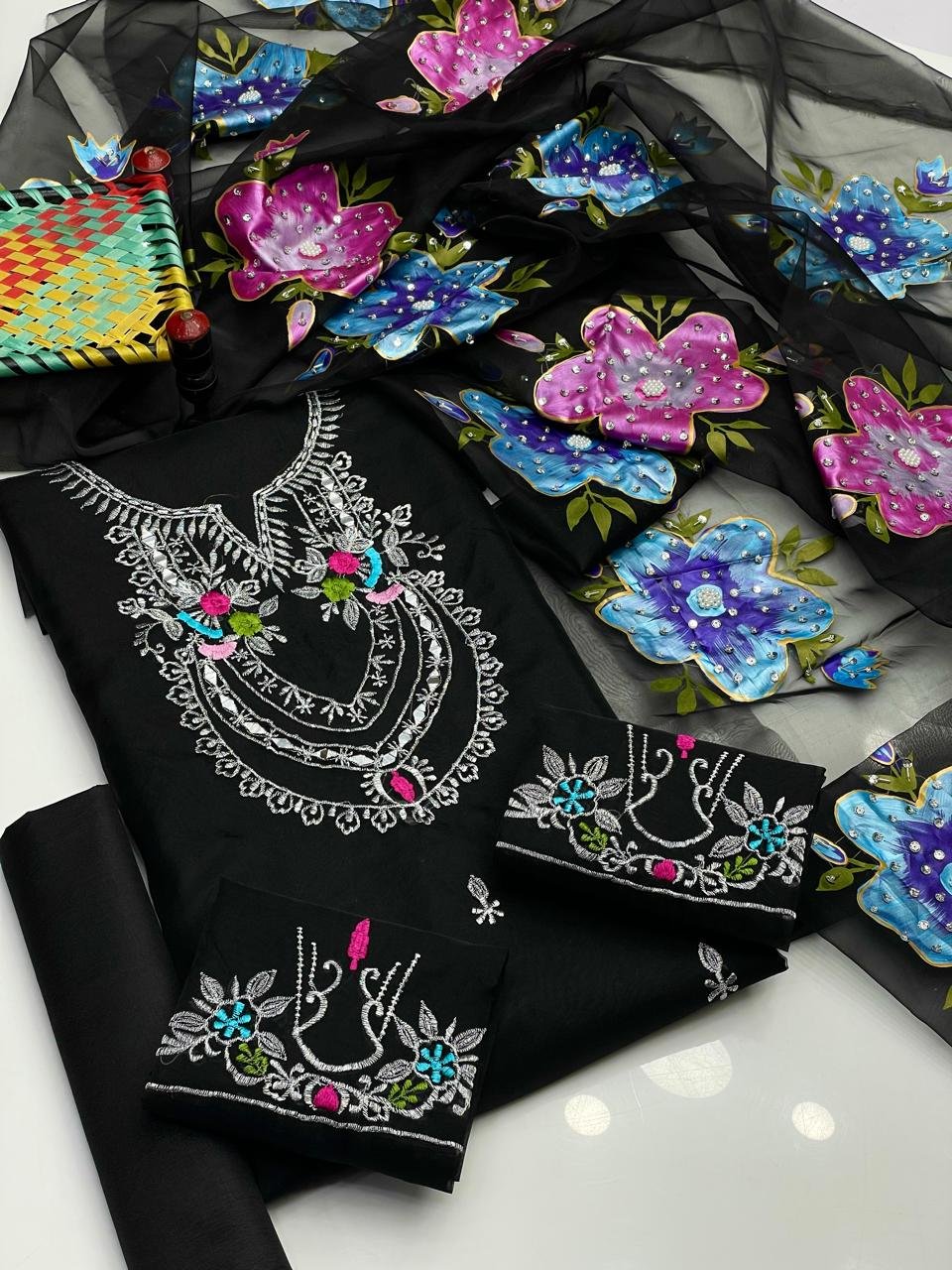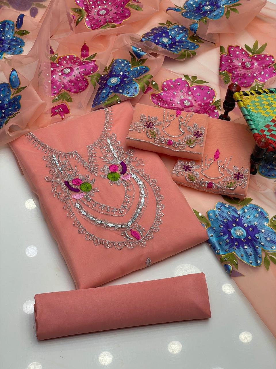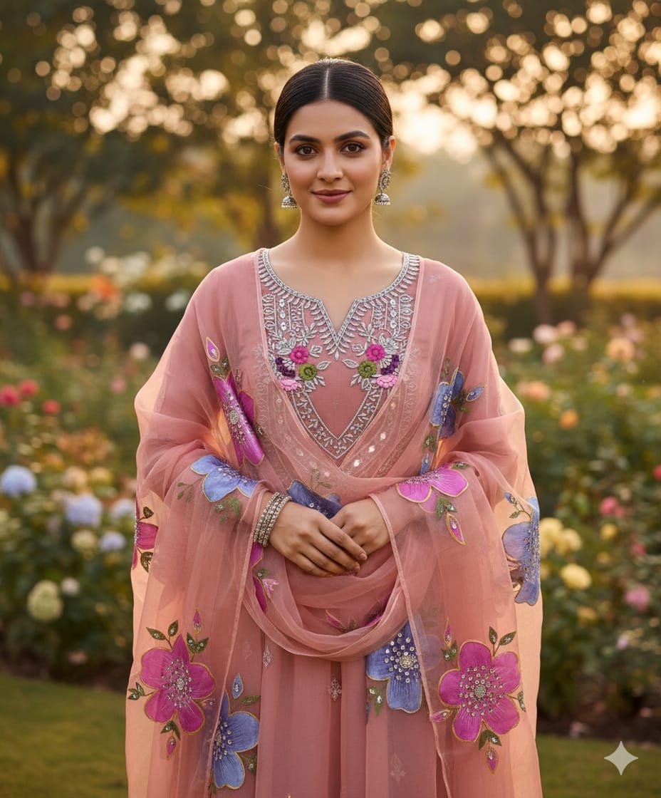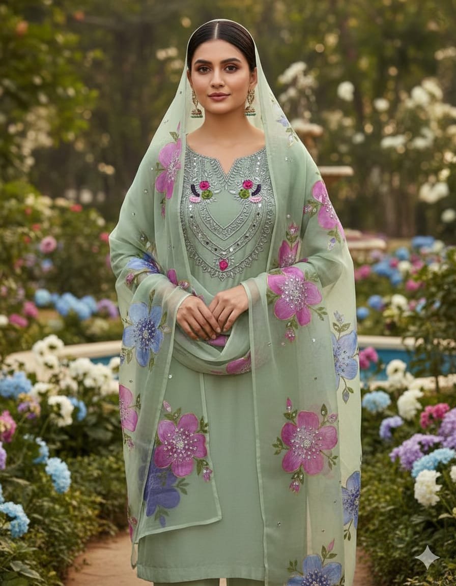 - 👗 Pure Organza Shirt with Mirror & Tilla Work – luxurious and festive