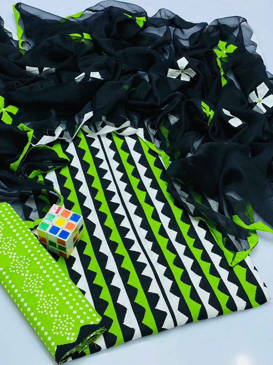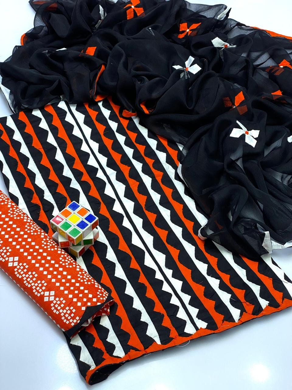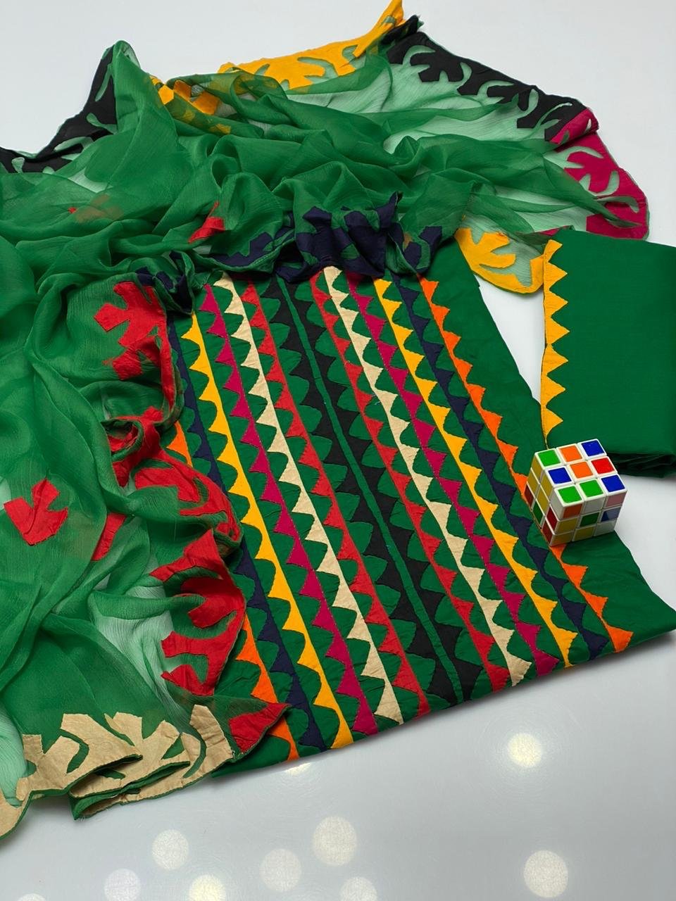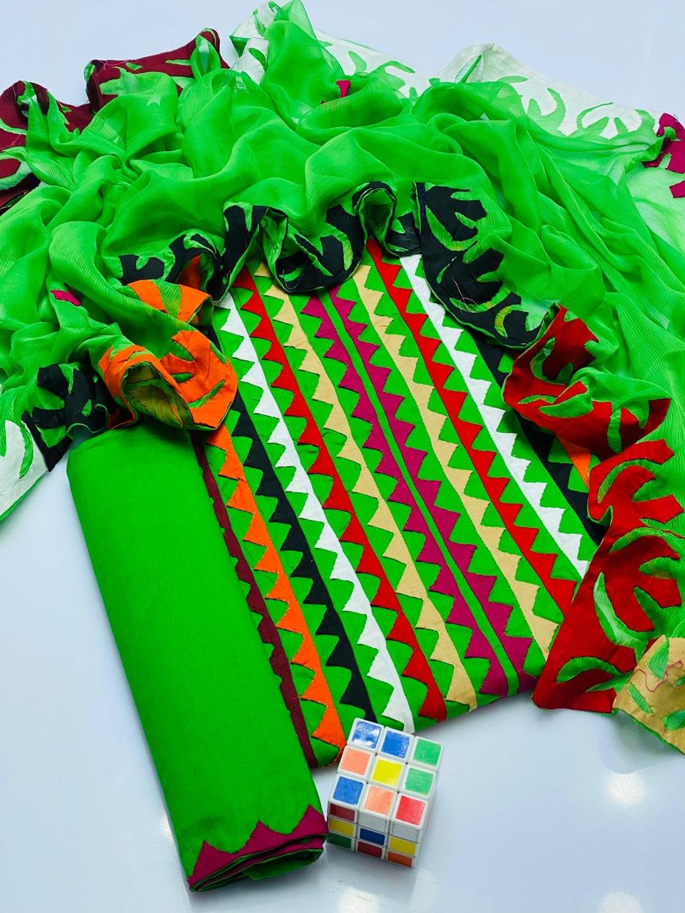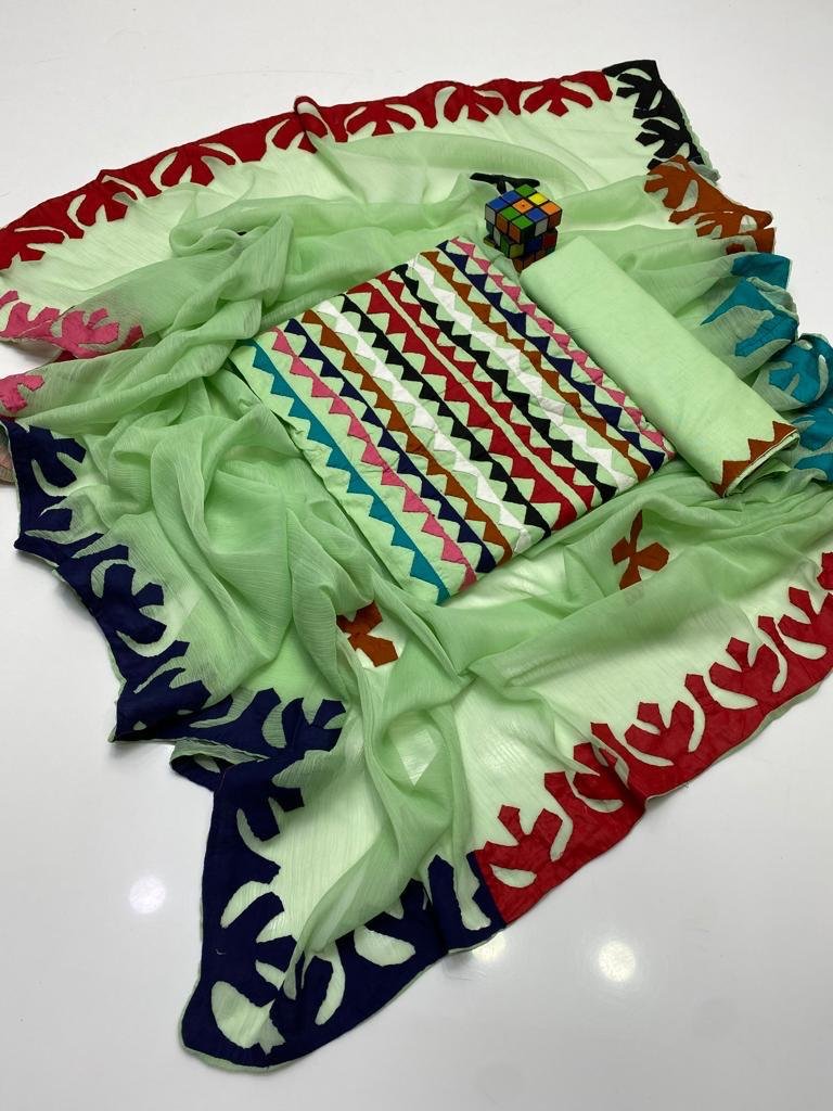 - 🧣 Crinkle Chiffon Dupatta with 4-Side Heavy Applique Work adding a luxurious and festive touch.